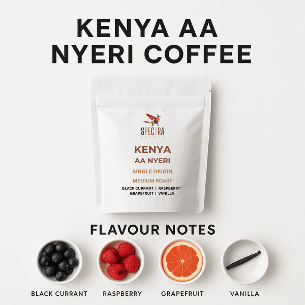 Kenya Nyeri AA is one of the world’s most celebrated single origins. The “AA” grade signifies extra‑large, dense beans with high aromatic oil content. Grown on the volcanic slopes of Mt. Kenya and the Aberdare Range, Nyeri coffees develop slowly, concentrating sugars and acids in the cool, high elevations. This results in a cup with lively black‑currant sweetness and a wine‑like acidity—a vivid, fruit‑forward flavour that sets Kenyan coffee apart.